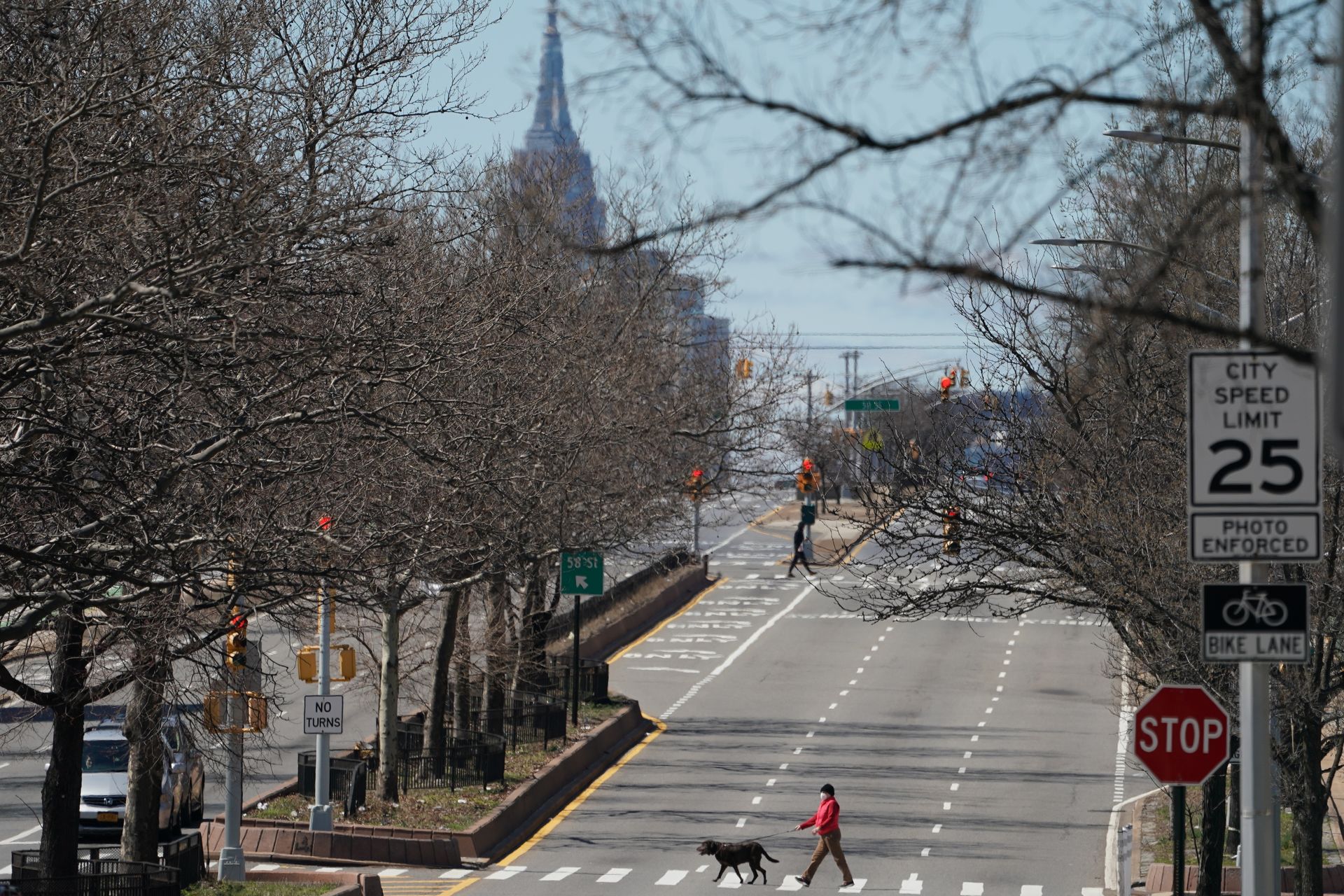 Una persona usa una máscara mientras pasea a un perro por Queens. en el distrito de Queens en Nueva York. La semana pasada, el gobernador de Nueva York, Andrew Cuomo, emitió un cierre estatal de todos los negocios no esenciales y el confinamiento de la población sus hogares.