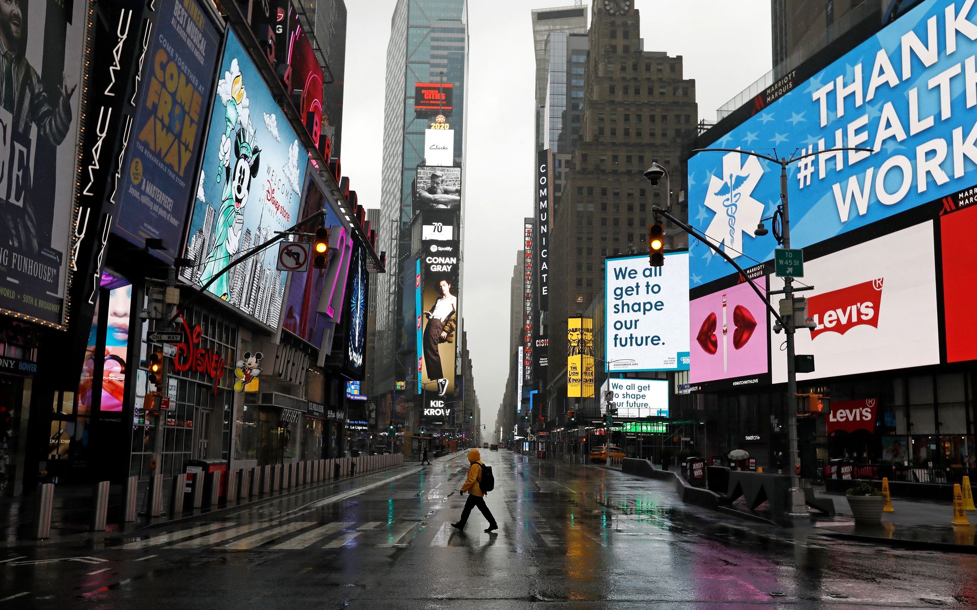 Una persona camina por un Times Square casi vacío. Se ha decretado el cierre en todo el estado de todas las empresas no esenciales para detener la propagación del coronavirus y COVID-19.