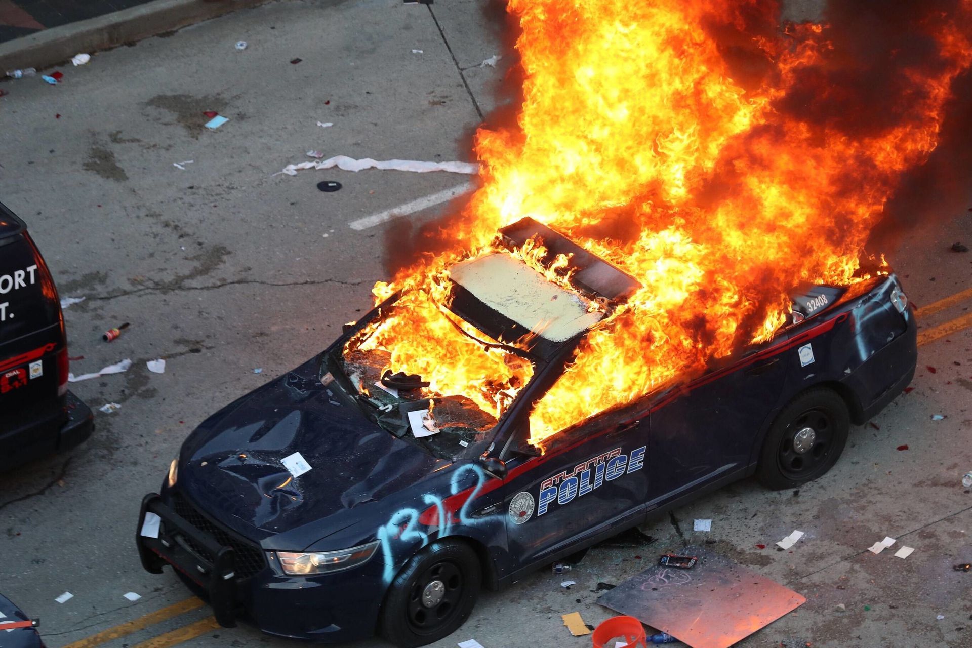 Un coche de policía arde en las cercanías del edificio de la CNN en Atlanta.
