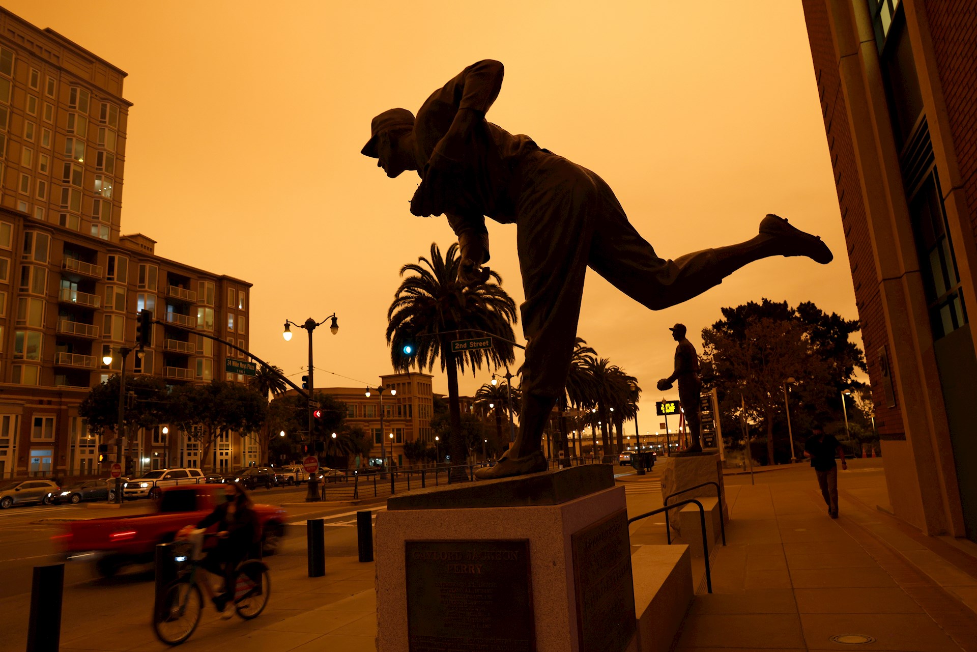 La estatura homenaje al histórico jugador de los Giants de San Francisco, Gaylord Perry, se dibuja sobre el cielo anaranjado que presenta la ciudad de San Francisco debido a los incendios forestales que permanecen activos en California.