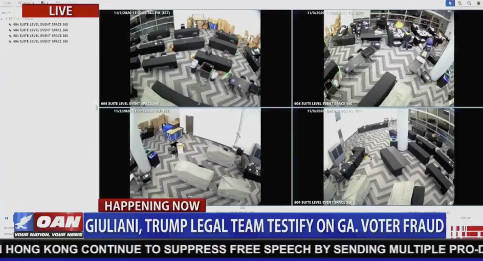 El 3 de diciembre, durante la exposición pública en Georgia, Rudy Giuliani y Jenna Ellis, letrados de la campaña del presidente de EEUU, mostraron al Comité del Senado de Georgia unas imágenes captadas por las cámaras de seguridad del estadio Farm Arena en Atlanta. Según Ellis, la sala donde se cuentan los votos fue despejada obligatoriamente por un supervisor a las 10:30h p.m. Sin embargo, en el vídeo de la noche electoral se aprecia cómo cuatro trabajadores electorales desobedecen la orden del supervisor. Esas mismas cuatro personas permanecen en las mesas hasta que comienzan a sacar lo que parecen cajas y maletas llenas de papeletas. A continuación, el grupo se queda contando votos sin presencia de observadores y con el estadio desalojado.