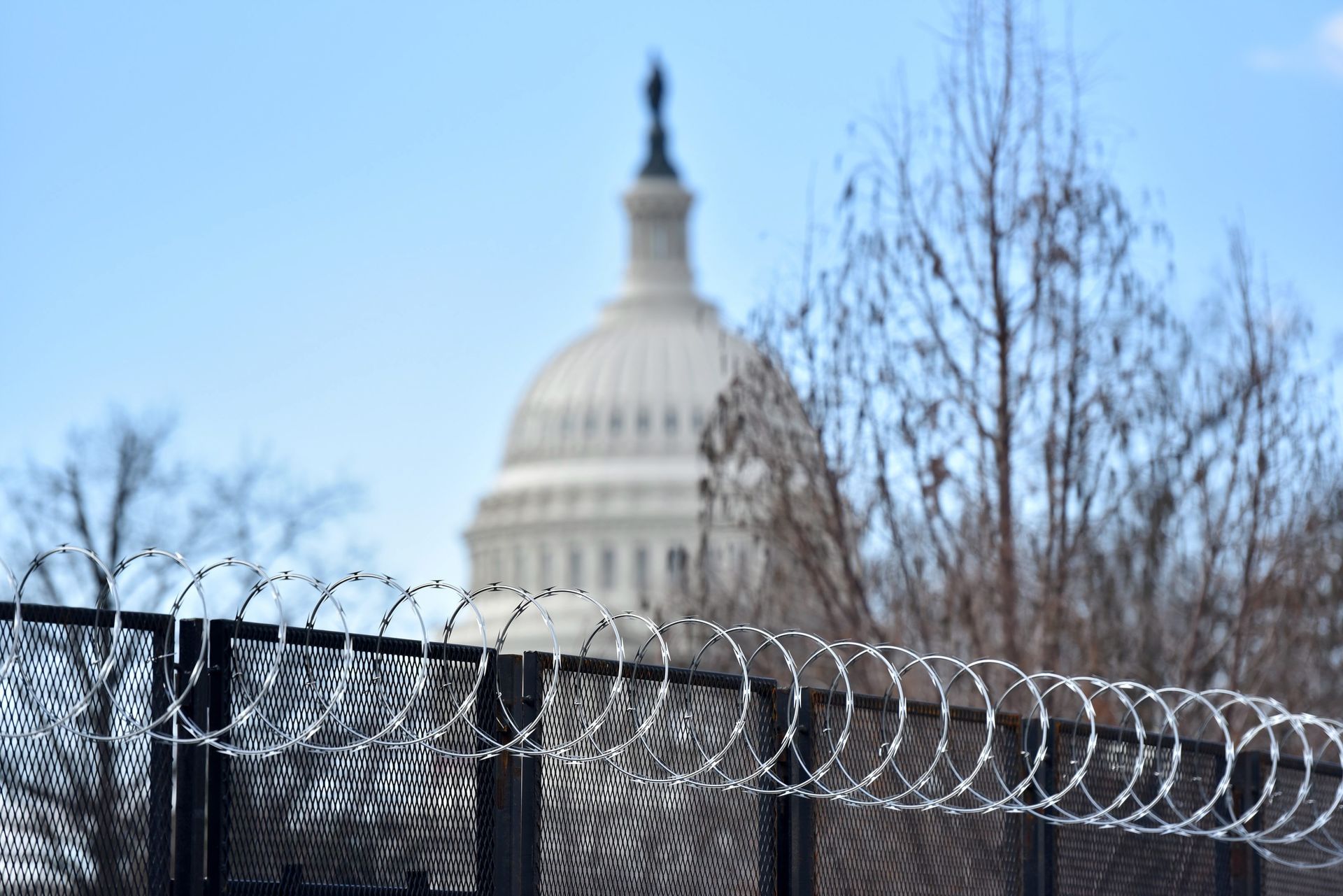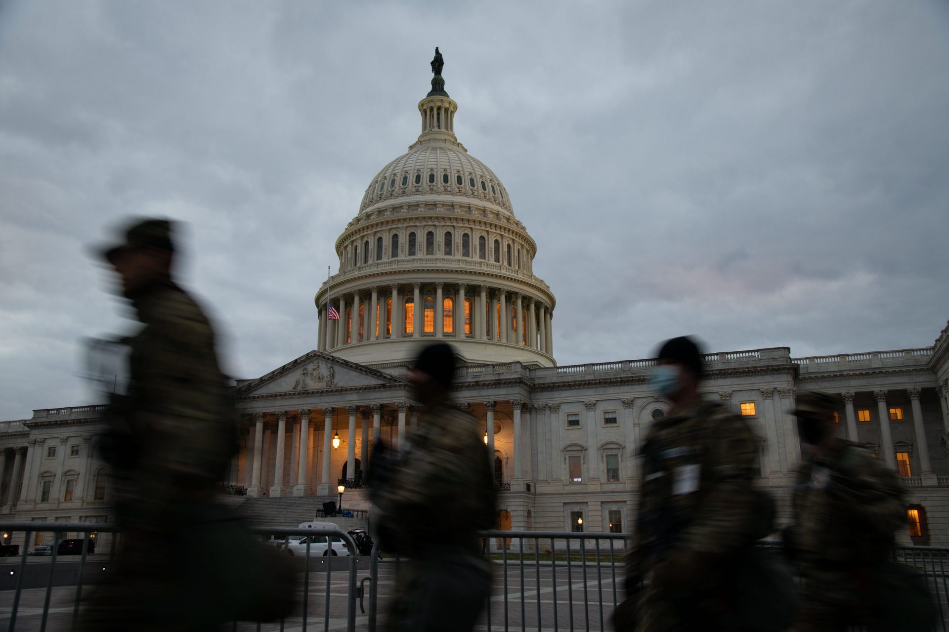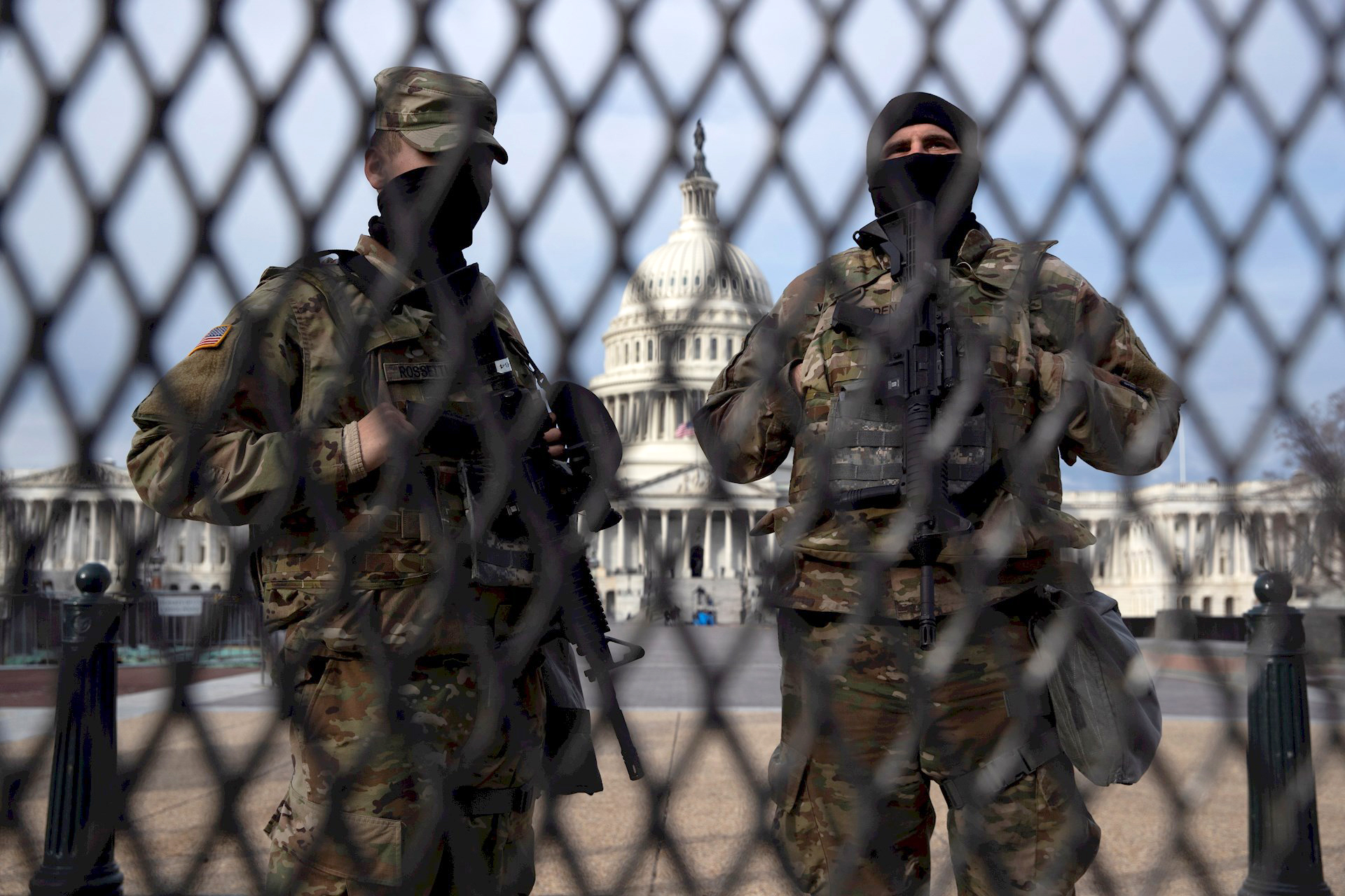 Miembros de la Guardia Nacional detrás de una valla frente al Capitolio de los Estados Unidos, en Washington DC desplegados días antes de la toma de posesión de Joe Biden como el 46º presidente de los Estados Unidos.