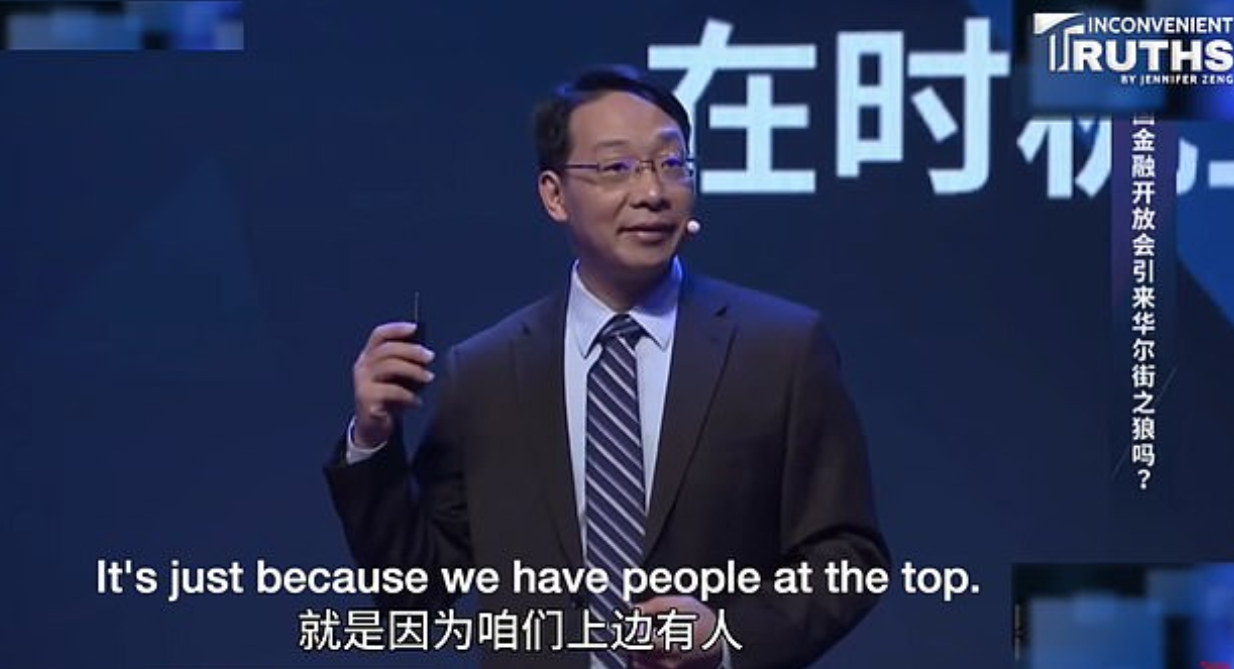 Finalmente, se salieron con la suya. "El señor de la librería muy enfadado se puso a ordenar mesas y sillas para la presentación del libro de Xi. Le pregunté a la anciana que cómo lo había convencido. Ella me comentó: "He razonado con él". Se refería a una famosa frase de la película de El Padrino. Cuando le cortan la cabeza de un caballo y lo meten en la cama de alguien. Y ¿saben quién es ella?, y, ¿por qué ha estado viviendo en China durante 30 años y por qué tenía ese acento perfecto? Pues, ¿recuerdan la gran institución de Wall Street mencionada antes? Ella es la presidenta de sus operaciones en Asia. No puedo decir más sin ser políticamente incorrecto, aplaudan, aplaudan si quieren", ríe Di Dongsheng mientras recibe una gran ovación de los espectadores chinos en la sala.