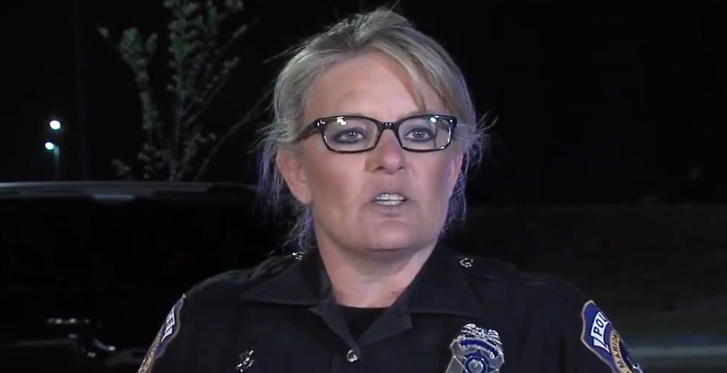 IMPD Officer Genae Cook gives a briefing on the mass casualty situation at a FedEx facility on the southwest side of Indianapolis.