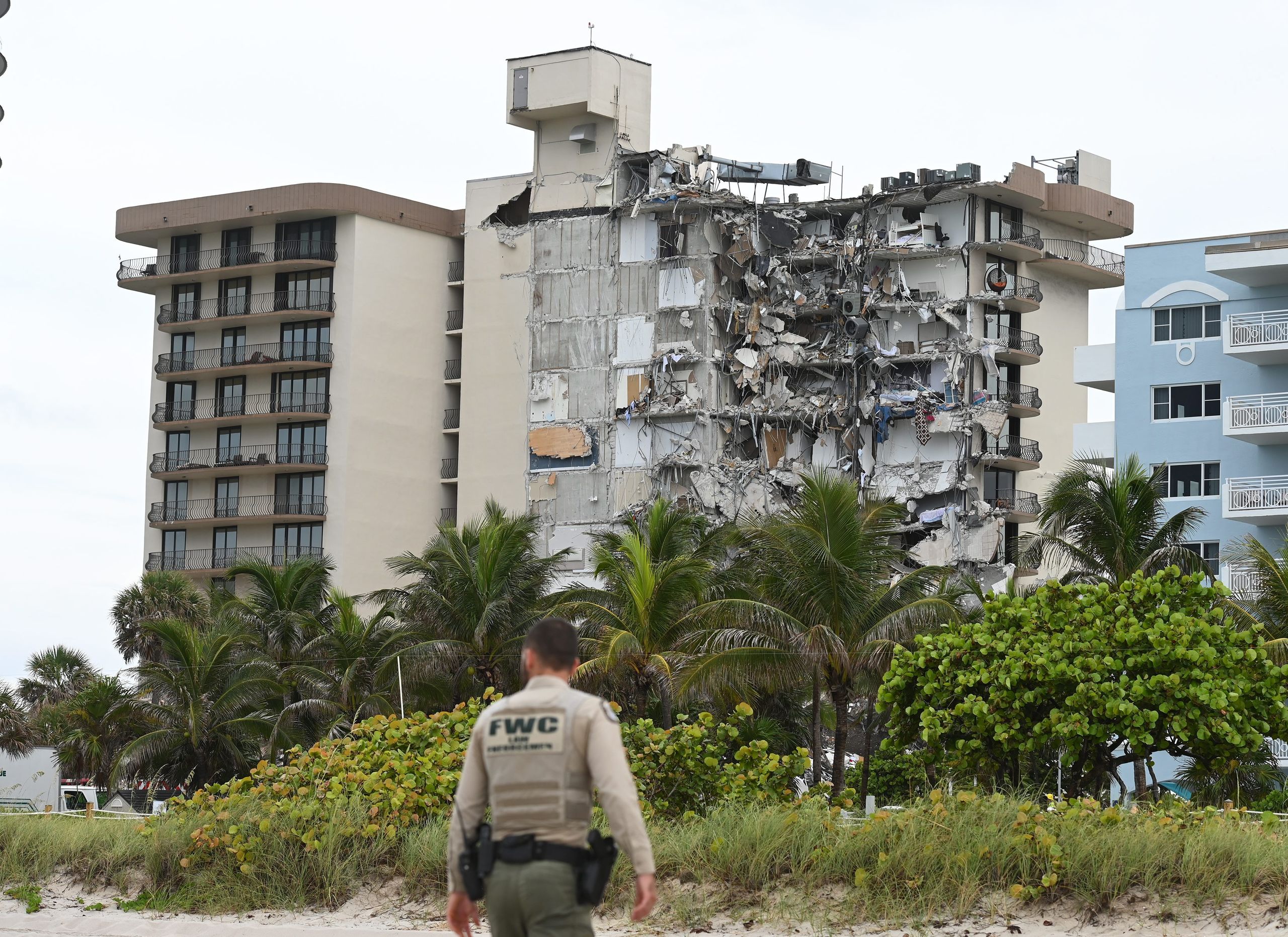 Un oficial de la policía de Miami observar el desastre después del derrumbe.