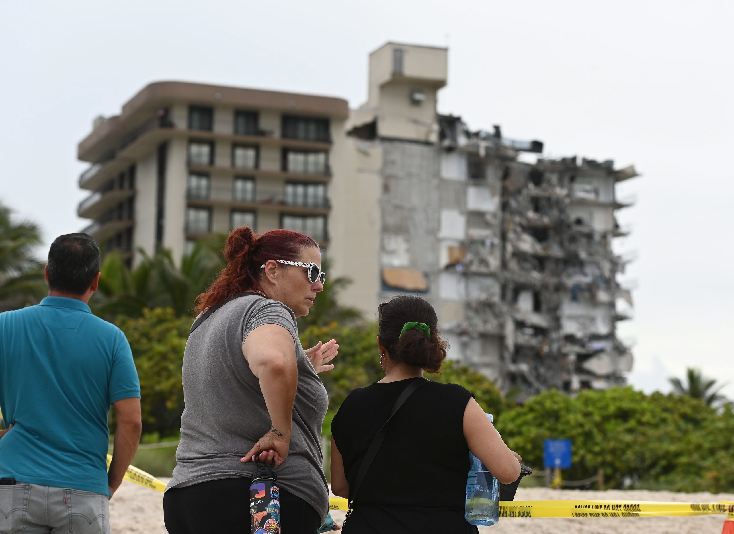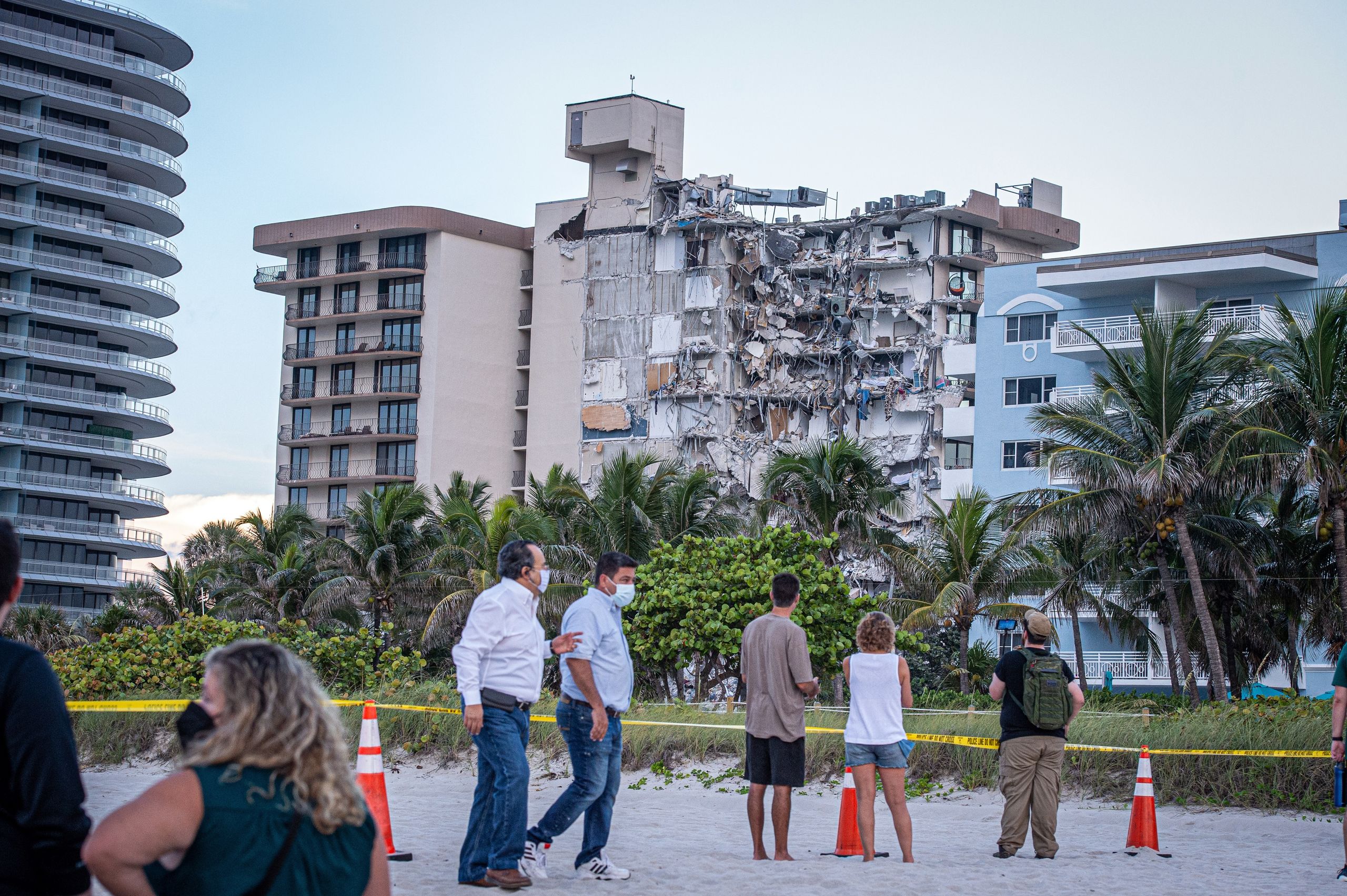 Personas observan desde la playa los destrozos y escombros del edificio derrumbado en Miami.