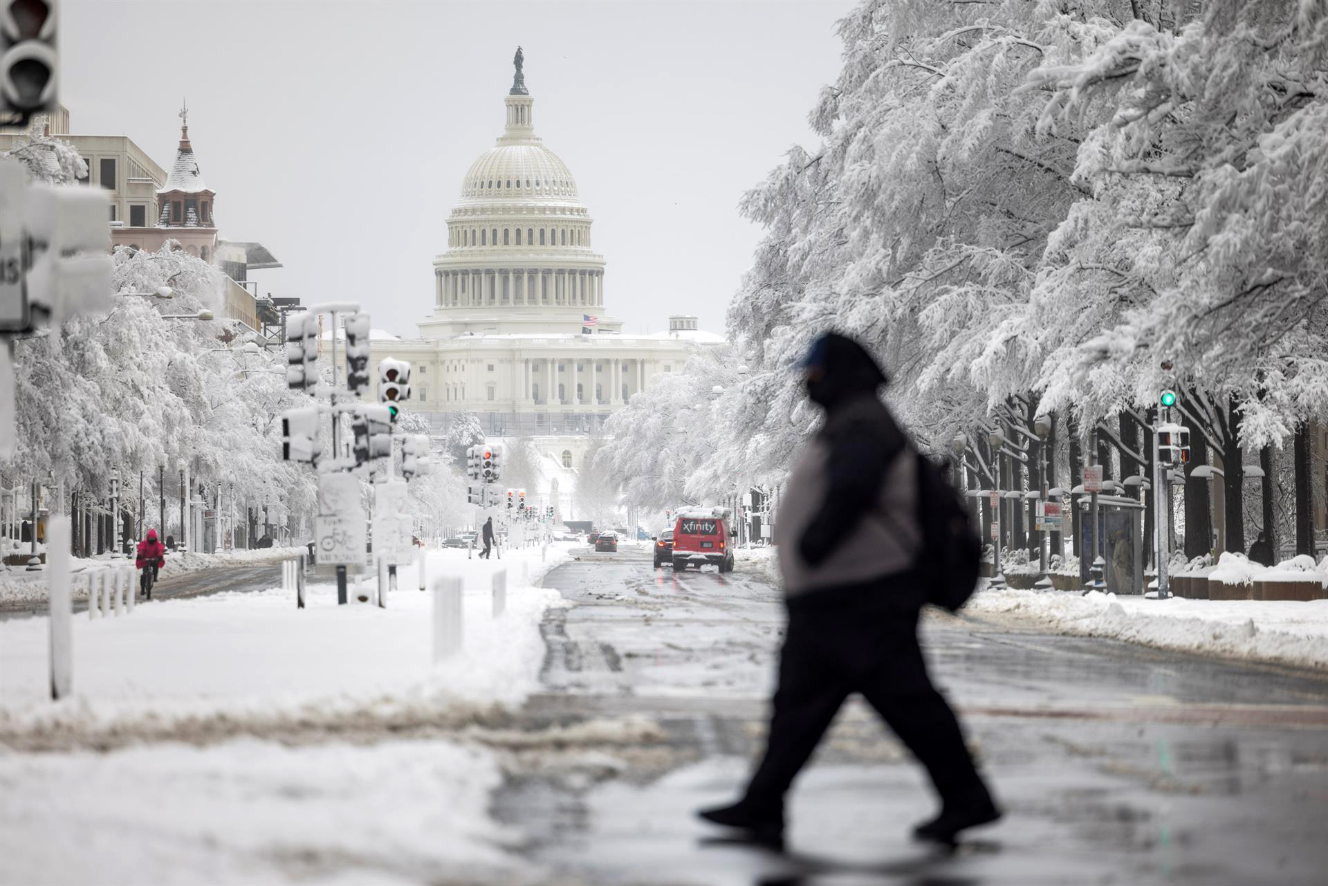 Un peatón cruza la avenida Pennsylvania durante una tormenta de nieve en Washington DC.