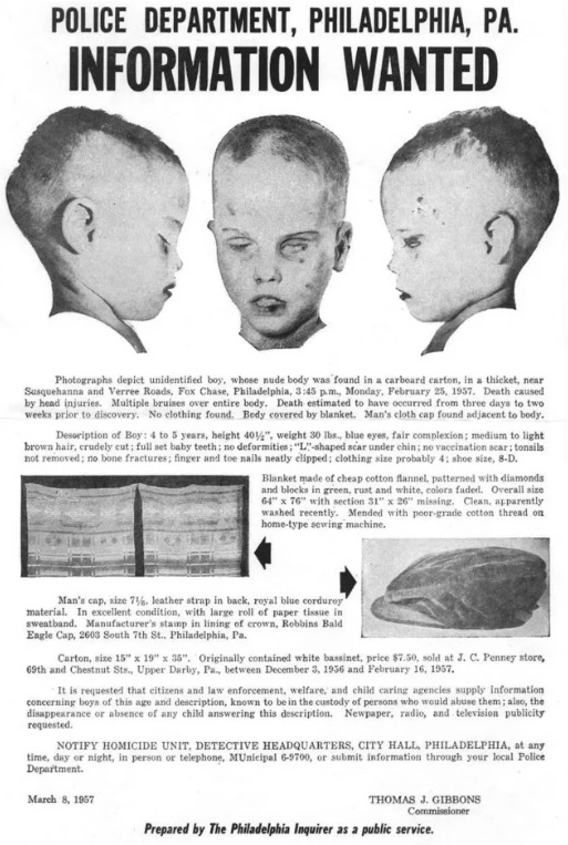 ‘El niño desconocido de Estados Unidos’, como versaba en su lápida en el cementerio de Ivy Hill, era Joseph Augustus Zarelli. Nació el 13 de enero de 1953 y su cadáver fue hallado el 25 de febrero de 1957 en una zona boscosa del vecindario de Fox Chase. Se cree que murió unos días antes, pero no se ha podido determinar cuántos exactamente.