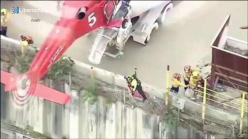 Los servicios de emergencia de Los Angeles, en Estados Unidos, han precisado de un helicóptero para rescatar a un hombre que se había caido al río en la ciudad. La fuertes lluvias que han caido en California han propiciado que el cauce del río baje con mucha agua y mucha fuerza, lo que hizo más complejo el rescate. El depertamento de bomberos de la ciudad hizo uso de un helicóptero para bajar a uno de sus efectivos y engancharlo al hombre que resistía la corriente agarrado a un muro. Por suerte, el bombero alcanzó al hombre y lo enganchó al arnés para facilitar la labor del helicóptero. El hombre se recupera ahora en un hospital tras sufrir los efectos de la hipotermia.