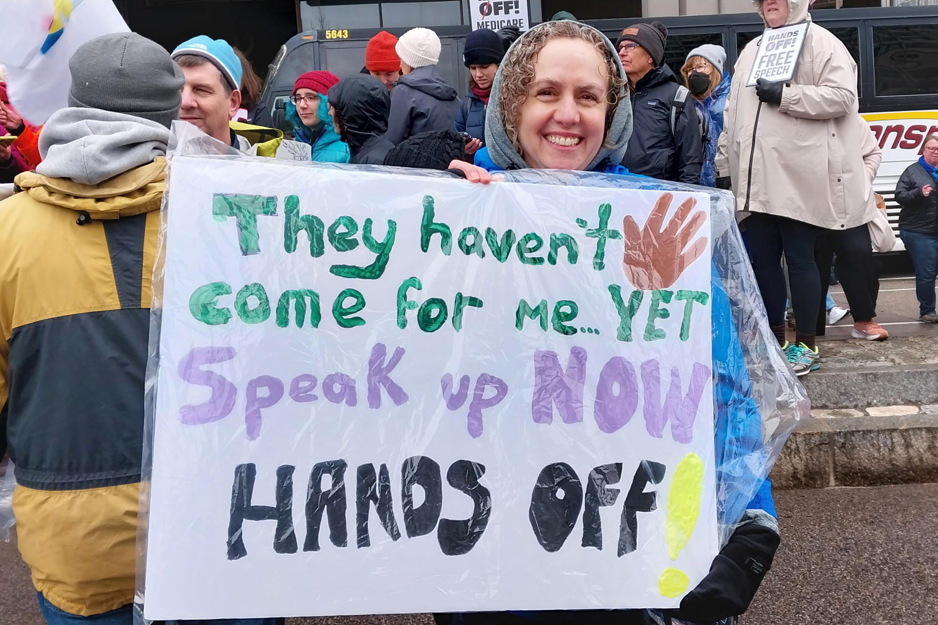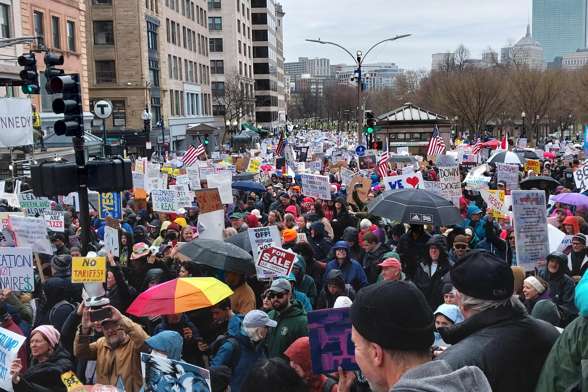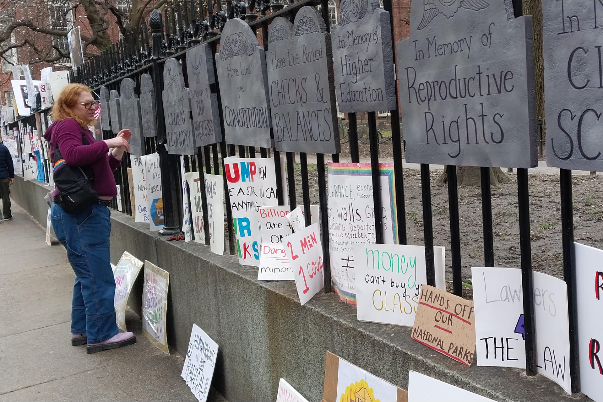 La convocatoria, lanzada bajo el lema "¡Las manos fuera!", ha reunido a manifestantes en capitolios estatales, sedes federales, oficinas de congresistas, sedes de la Seguridad Social, parques y ayuntamientos de todo el país. En Boston, una mujer observa algunos carteles.