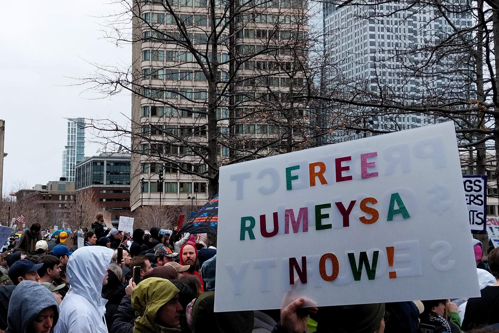 ''Free Rumeysa now'': Rumeysa es la estudiante turca que fue detenida por agentes de inmigración enmascarados cuando esta se dirigía a una cena para celebrar el Ramadán. Se la llevaron a bordo de un vehículo sin identificación.