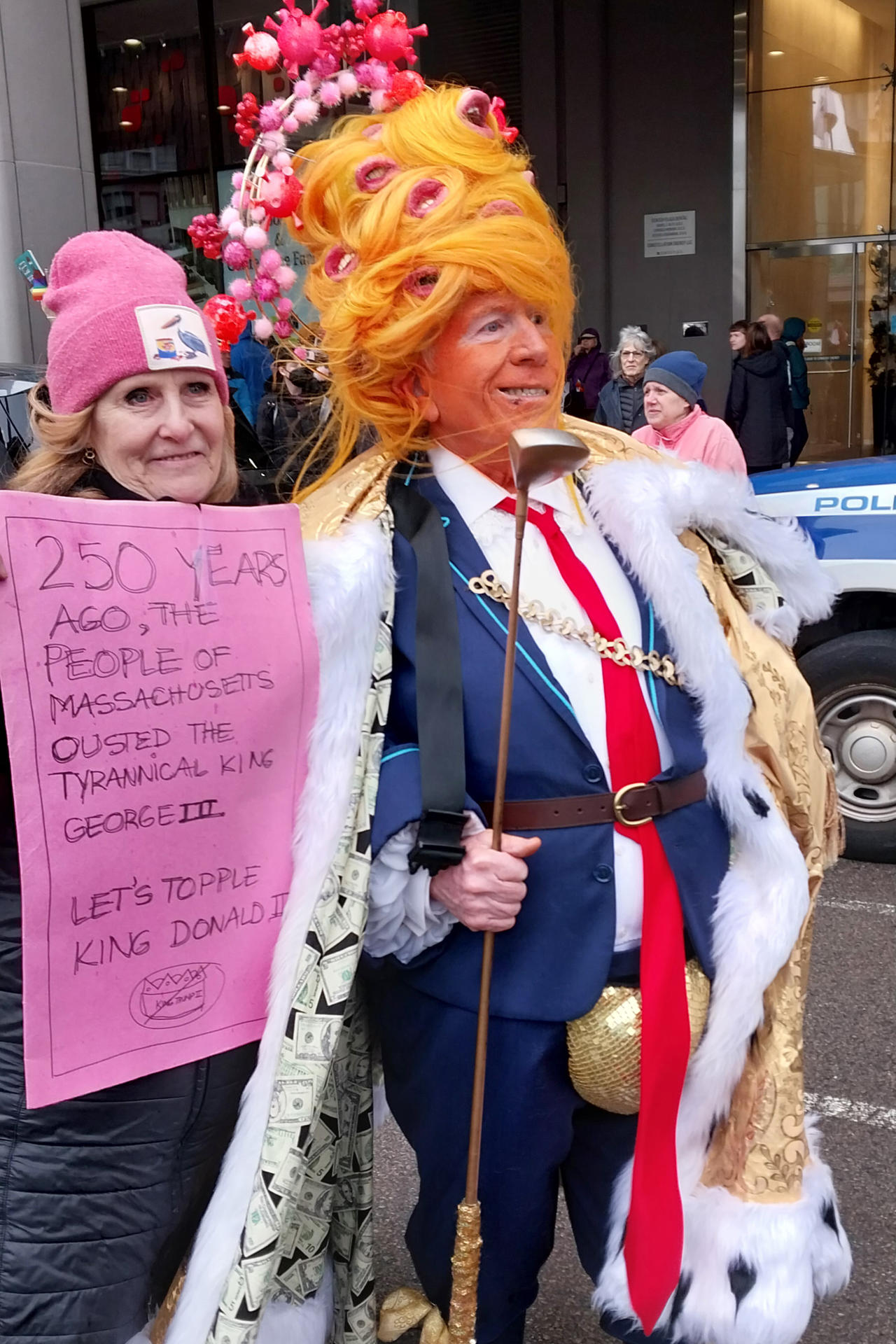 Un hombre disfrazado como el presidente de los Estados Unidos, Donald Trump desfila junto a un cartel que dice: ''Hace 250 años, el pueblo de Massachusetts derrocó al tiránico rey George III. Derroquemos al rey Donald Trump''.
