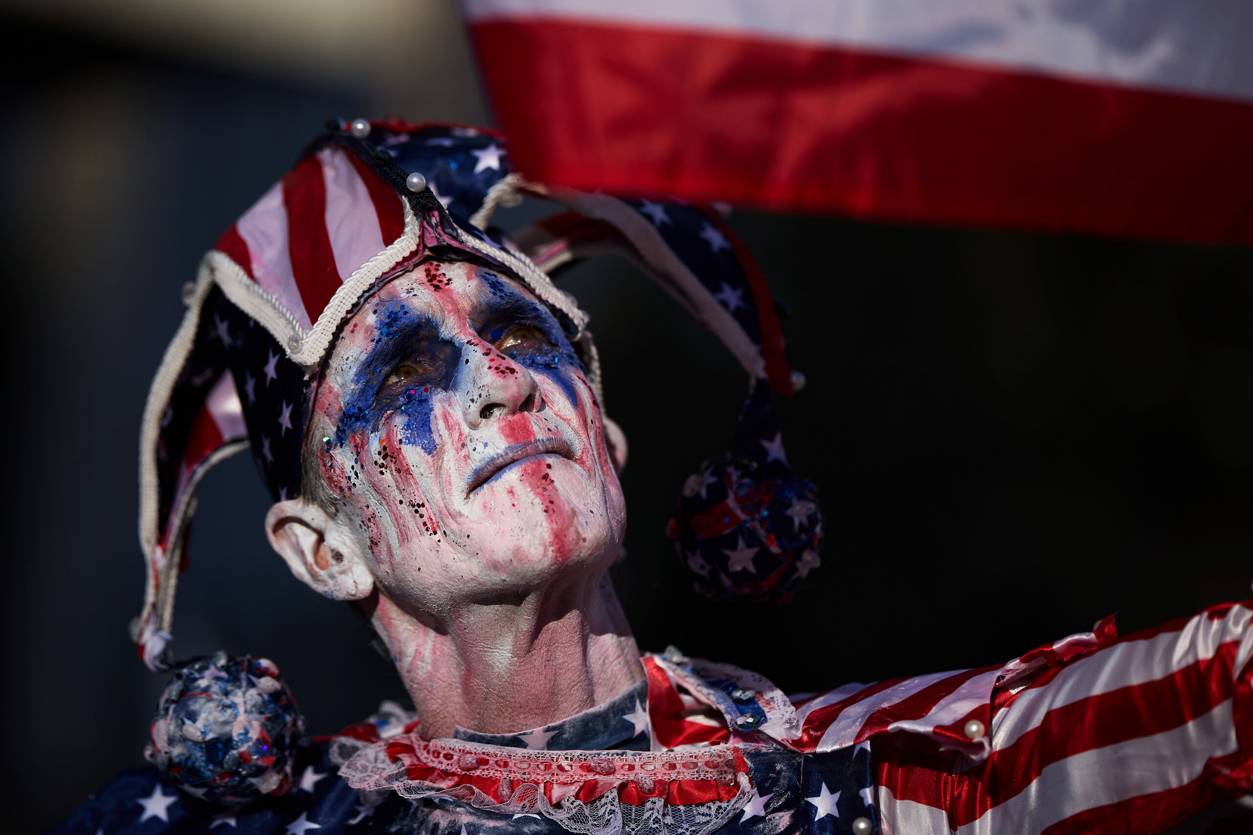 En Los Angeles, una persona disfrazada de una especie de Joker patriota protesta contra Trump.