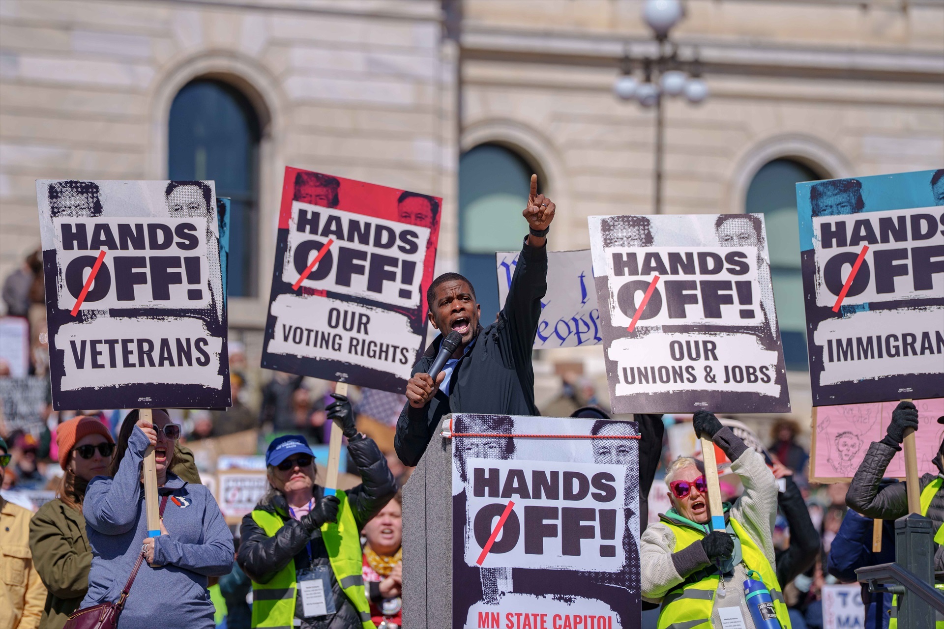El alcalde de Saint Paul, Melvin Carter, pronuncia un discurso en la manifestación "Hands Off" contra las políticas del presidente de los Estados Unidos, Donald Trump, y su asesor, Elon Musk, en el Capitolio estatal.