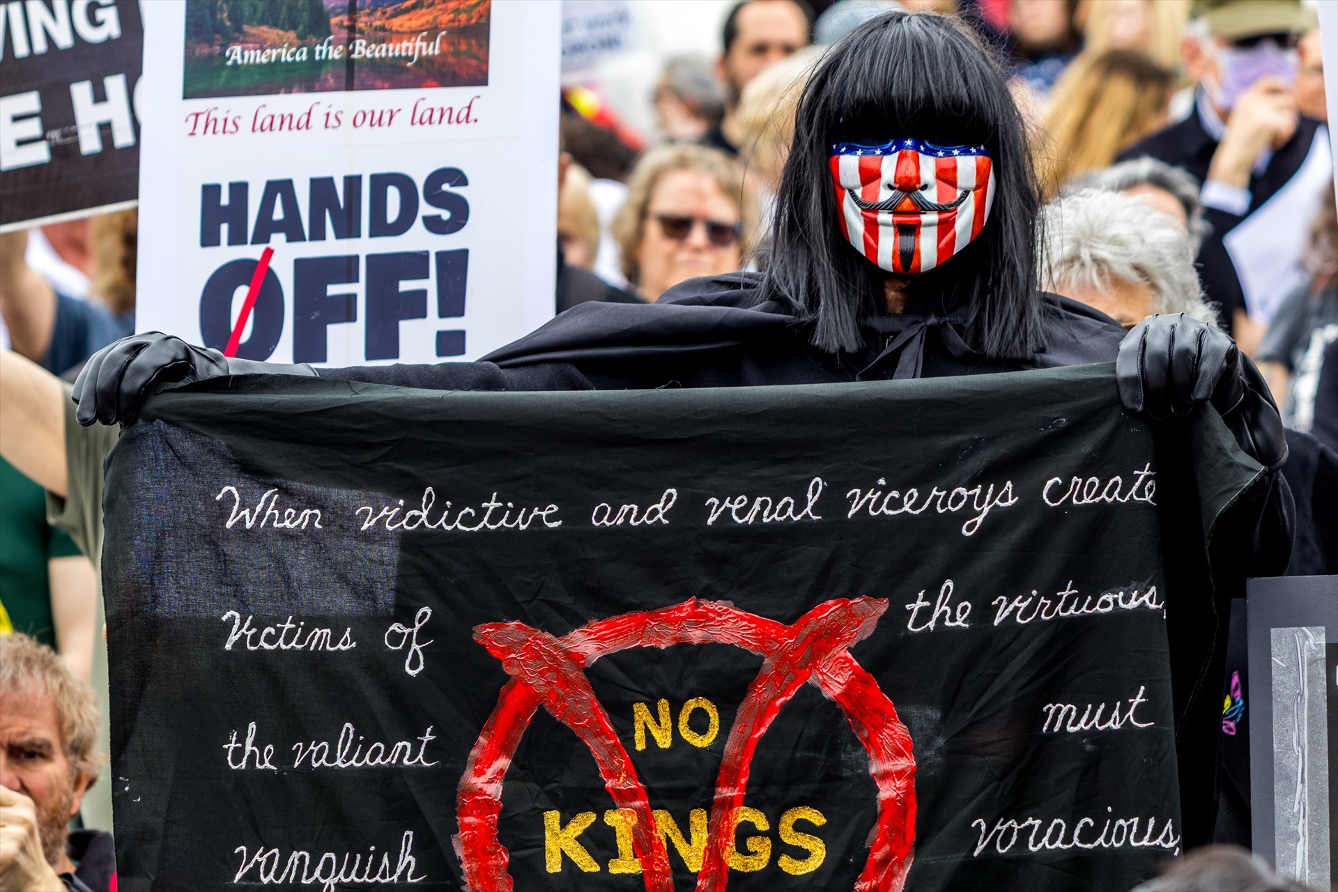 Una persona disfrazada con la máscara de V de Vendetta pintada con la bandera de EEUU. En su cartel, con un lenguaje muy cargado y literario, se puede leer: "Cuando virreyes vengativos y viles convierten en víctimas a los virtuosos, los valientes deben vencer a los reyes voraces."