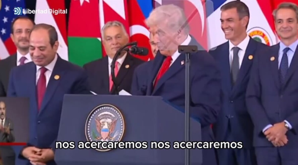 El presidente de Estados Unidos fue repasando la lista de la treintena de mandatarios que participan este lunes en El Cairo en la histórica cumbre con motivo de la ceremonia de la firma del plan de paz para Gaza. Al llegar el turno de España dijo: "España ¿Dónde está España? ¿Estáis trabajando ya sobre el PIB?" En ese momento se ha girado para encontrarse con la mirada de Sánchez, sonriente, y en un tono distendido ha continuado: "Nos acercaremos, nos acercaremos. Estáis haciendo un trabajo fantástico".
