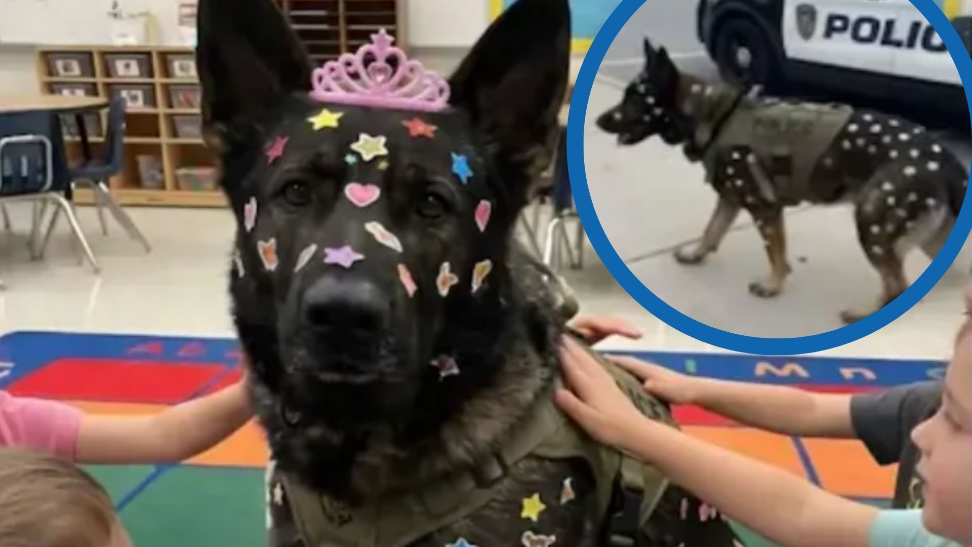 El binomio K-9 formado por el agente Blitz y su guía acudió a una jornada de orientación profesional en un colegio de Estados Unidos. Lo que comenzó como una exhibición rutinaria de un perro de patrulla y detección de narcóticos terminó con el animal cubierto de pegatinas de colores y una tiara rosa sobre su cabeza.