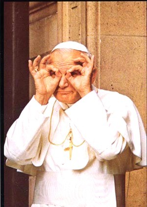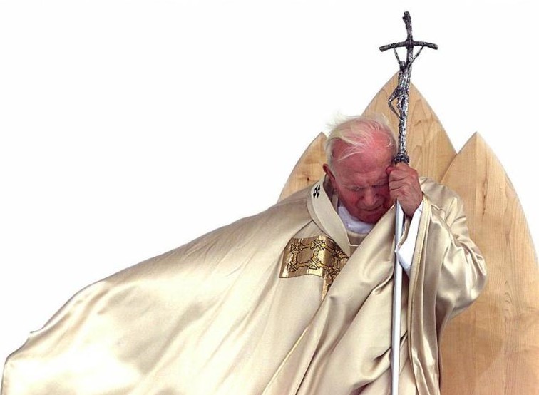 Ésta es una de las imágenes más populares durante el Pontificado de Juan Pablo II. Un ya mayor Pontífice se apoya en el báculo, coronado por el crucifijo que solía utilizar.