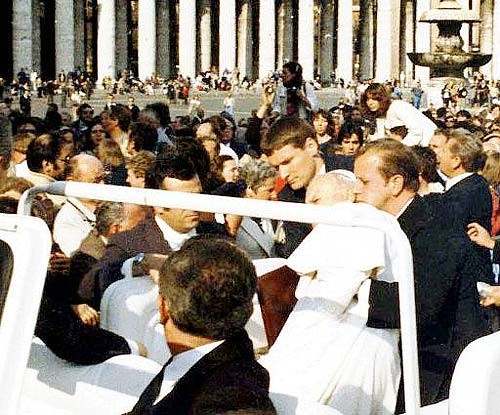 Mientras saludaba a los fieles, la pistola de Ali Agca asoma entre la multitud con el objetivo de acabar con la vida de Juan Pablo II.