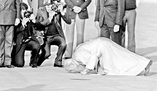 Era tradicional que el Papa polaco besara la tierra que pisaba en sus viajes. Así besaba el suelo de Madrid en su primera visita como Pontífice a España en 1982.