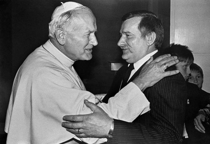 Juan Pablo II abraza a Lech Walesa, líder del sindicato Solidaridad, que inició el germen que acabó con el comunismo en Polonia. Walesa siempre reconoció el papel clave de Wojtyla para provocar el hundimiento del socialismo soviético.