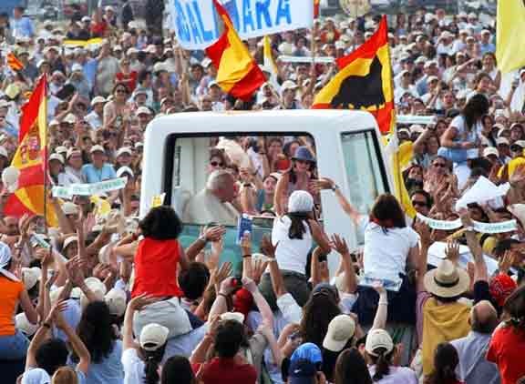 Jóvenes españoles saludan al Papa en el último viaje de Juan Pablo II a España en 2003.