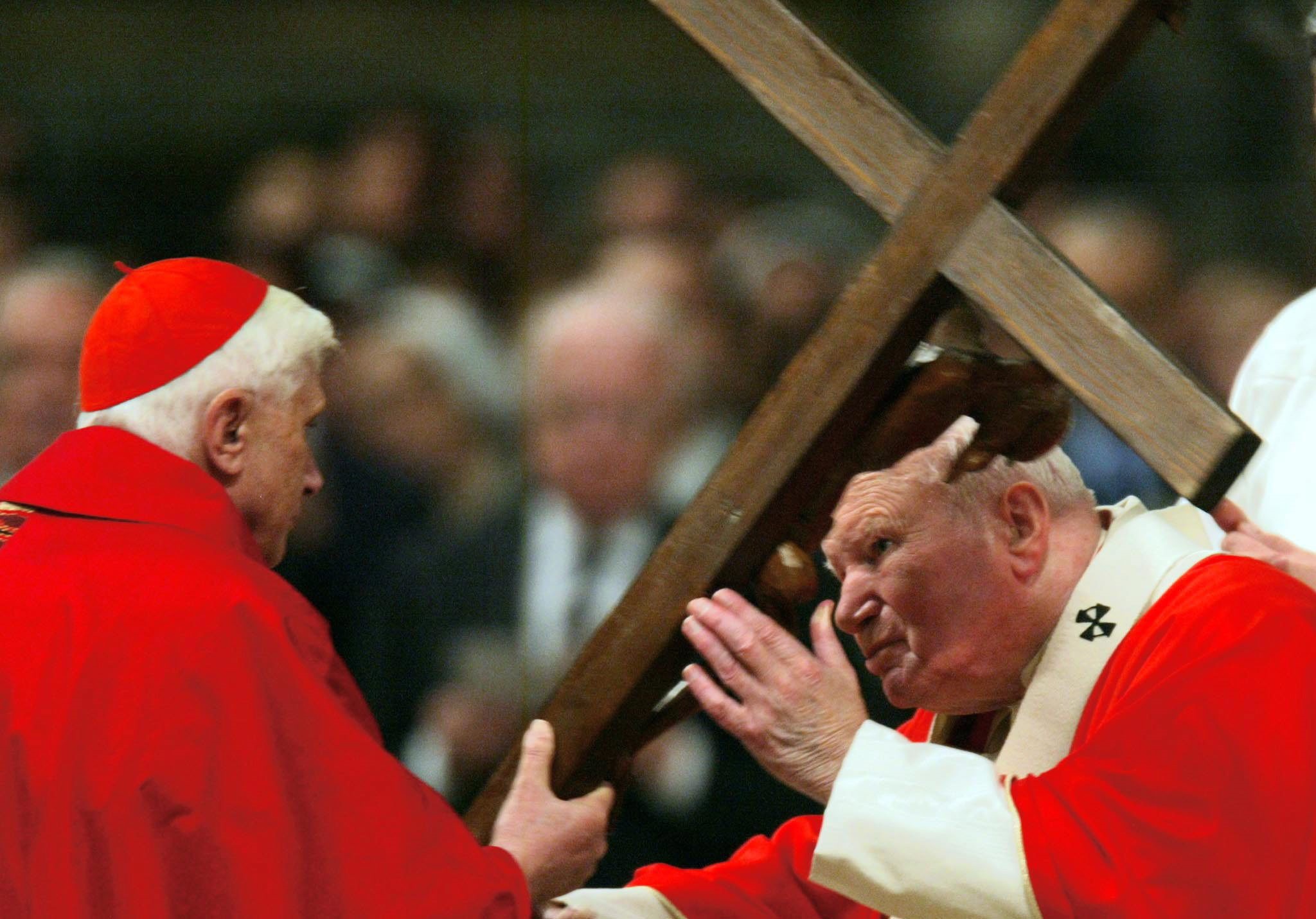 El Viernes Santo de 2004 en el Coliseo de Roma, Juan Pablo II entrega la cruz al cardenal Ratzinger, ahora Benedicto XVI. El que fuera prefecto para la Congregación para la Doctrina de la Fe fue el más fiel colaborador de Juan Pablo II.