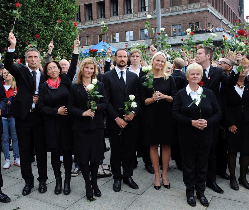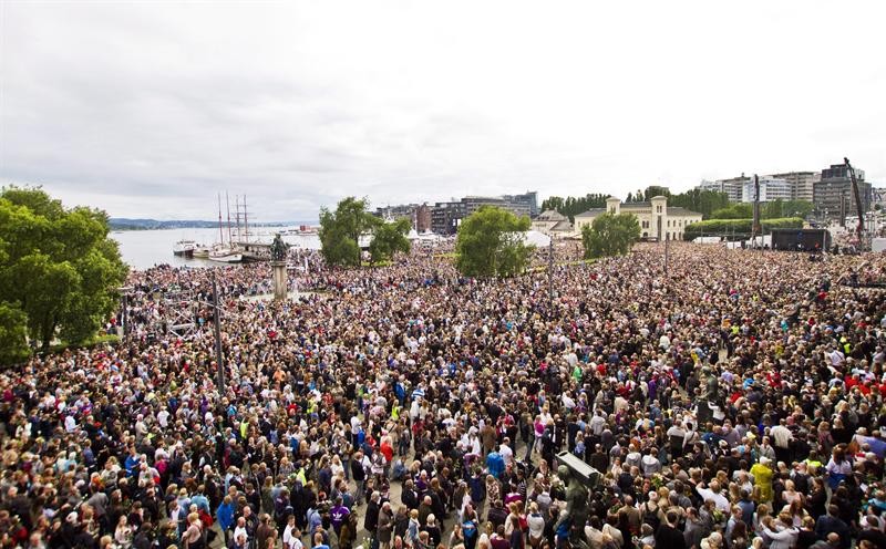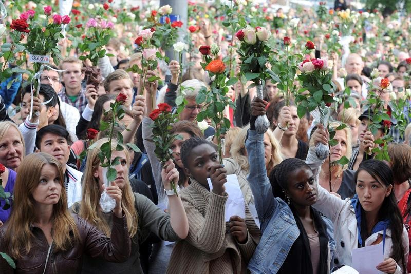 Más de 150.000 personas participaron este lunes en la denominada "Marcha de las rosas" en Oslo y otras ciudades noruegas para rendir homenaje a las 76 víctimas mortales del doble atentado del viernes en la capital y en el campamento de las juventudes socialdemócratas.