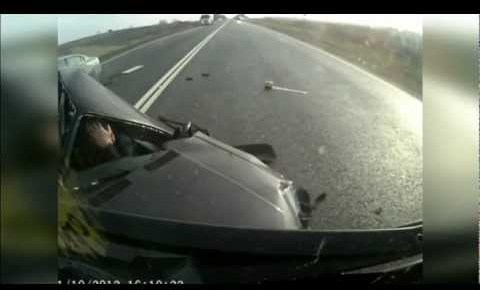 El conductor salió ileso, por el parabrisas, de un horrible accidente frontal en el que un vehículo colisionó con un camión.