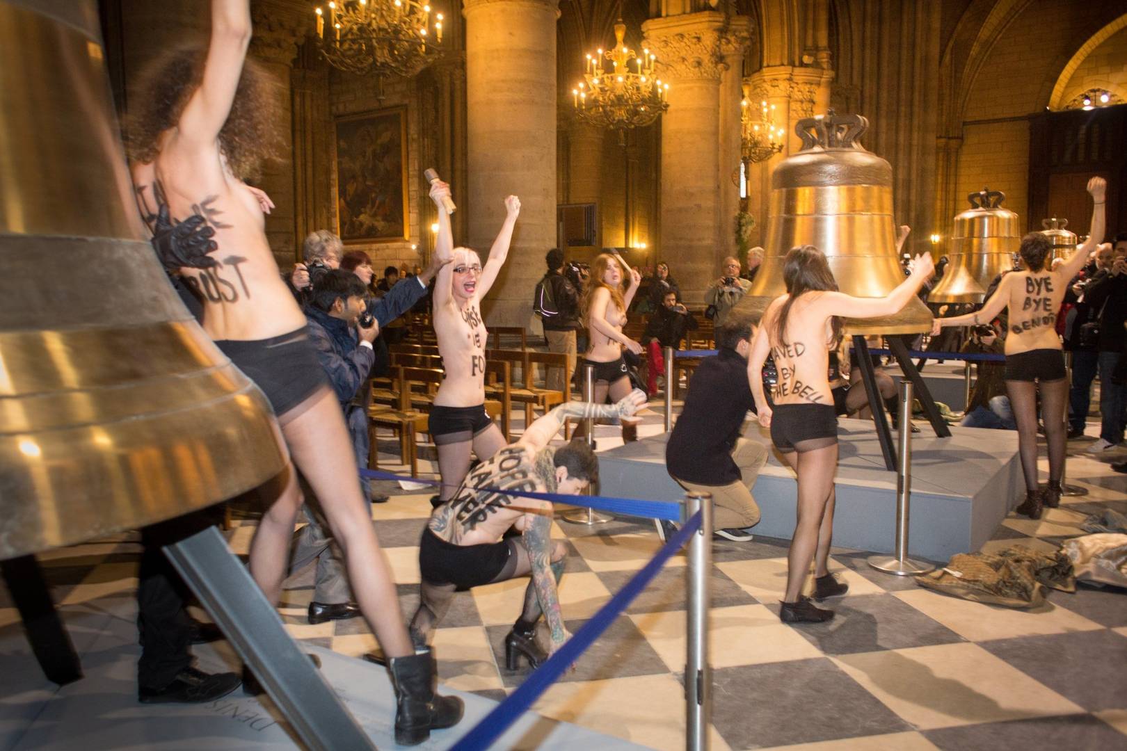 Una vez semidesnudas hicieron sonar tres de las nuevas campanas que exhibe Notre-Dame mientras gritaban en inglés los eslóganes que llevaban pintados en el cuerpo: "No más papa", "No a la homofobia" o "Crisis de fe". Los servicios de orden de la catedral gótica situada en la isla de la Cité, rodeada por el Sena, se apresuraron en evacuar a las manifestantes. Posteriormente, fueron detenidas por profanación, asalto y agresión.