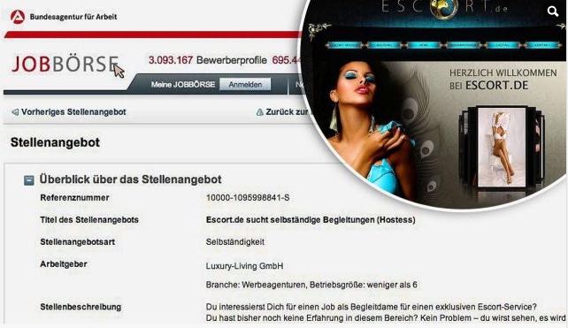 "¿Te interesa un trabajo como dama de compañía para un servicio exclusivo de acompañamiento? ¿No tienes experiencia en el sector? No hay problema, verás que hacemos lo posible para que te sientas a gusto", reza la oferta de "Escort.de" que ha publicado la oficina de empleo alemana.