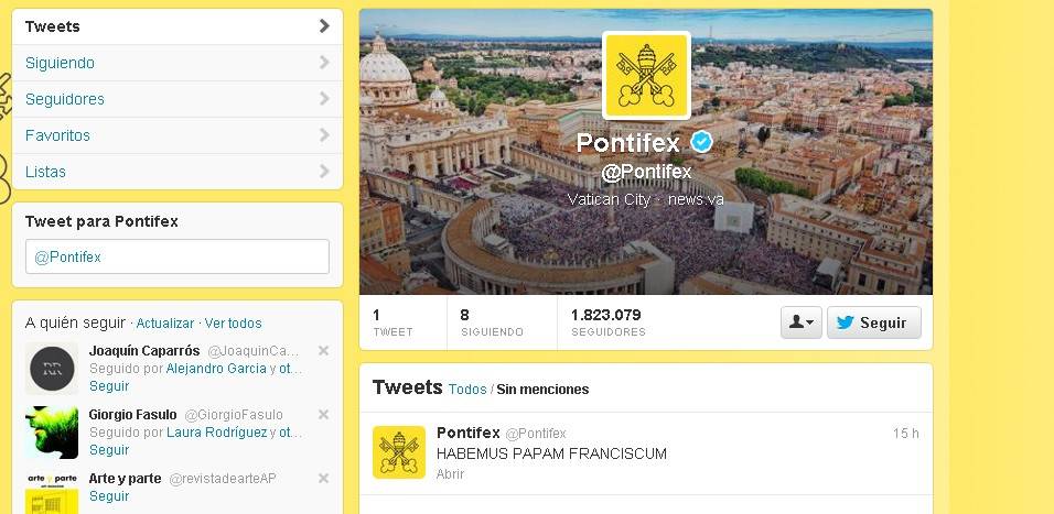 La cuenta de Twitter @pontifex, con la que el papa emérito Benedicto XVI desembarcó en esta red social y que había quedado desactivada temporalmente tras su renuncia, vuelve a estar operativa y su primer tuit ha sido: "Habemus Papam Franciscum".