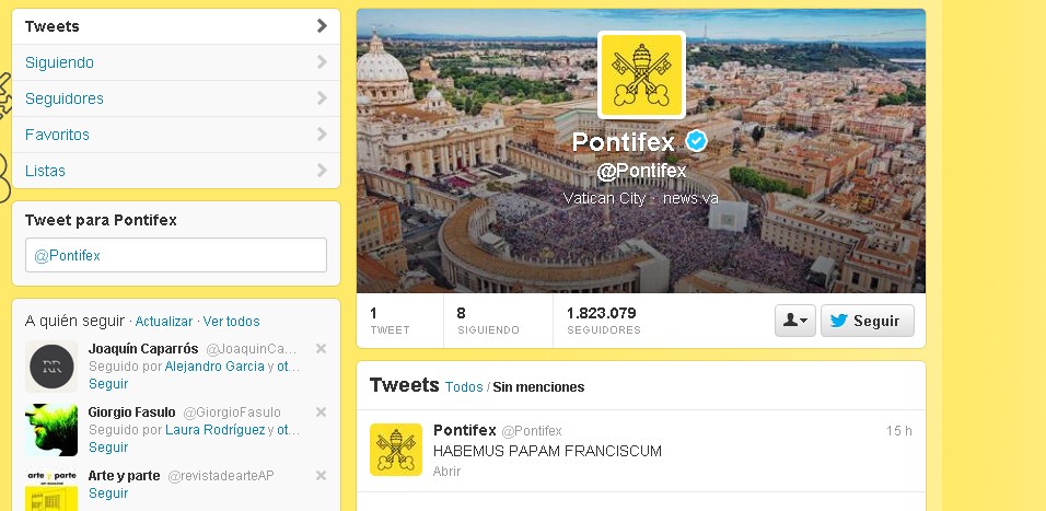 Según informa Efe, este primer tuit ha sido escrito alrededor de las 20:30 horas local -19:30 GMT- después de que el recién elegido pontífice, el cardenal argentino Jorge Mario Bergoglio, que ha escogido el nombre de Francisco, hiciera su primera aparición ante los fieles que llenaban la plaza de San Pedro del Vaticano.
