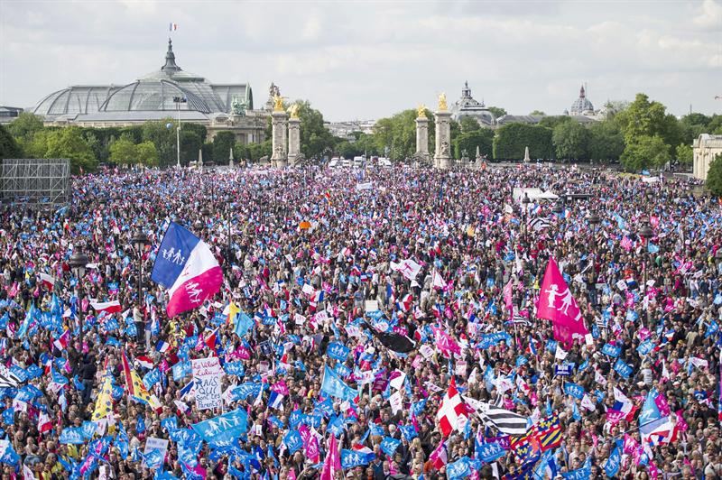 La tercera gran protesta de este tipo -en la que participaron 150.000 personas, según la policía, y "más de un millón", según los organizadores- estuvo vigilada por 4.500 agentes, ante la radicalización de las últimas marchas contra la autorización de las bodas gays en Francia.