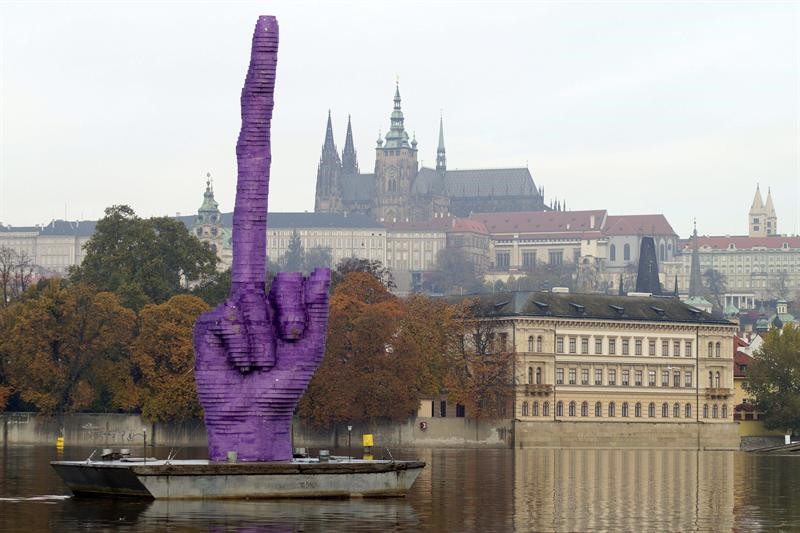 El polémico artista checo David Cerny ha mandado un particular mensaje de desprecio hacia el presidente del país, Milos Zeman, en forma de una enorme mano en forma de peineta que flota en el río Moldava frente al castillo de Praga, sede de la jefatura del Estado.