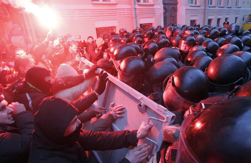 Un grupo de opositores que participa en la protesta de hoy en Kiev comenzó enfrentamientos con la policía que custodia la sede presidencial, mientras otro grupo entró en el Ayuntamiento, según distintos medios.