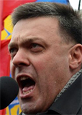 Ha participado desde el principio en las protestas, en las que fue agredido. Tyahnybok apareció en televisión acusando a sus colegas parlamentarios de haberle golpeado, furiosos por su participación en las manifestaciones. Es contrario a la integración en la UE, y está por ver el papel que juega junto a otros líderes opositores Arseniy Yatsenyuk y Vitali Klitschko.