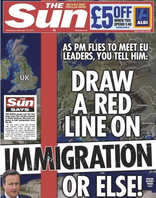 La portada del diario británico The Sun lleva hoy a sus portadas una advertencia al primer ministro británico, David Cameron, "¡Dibuja una línea roja en inmigración o vas a ver!" esta frase está superpuesta sobre una mapa de Europa dividido por una línea roja la que separa Europa en dos.