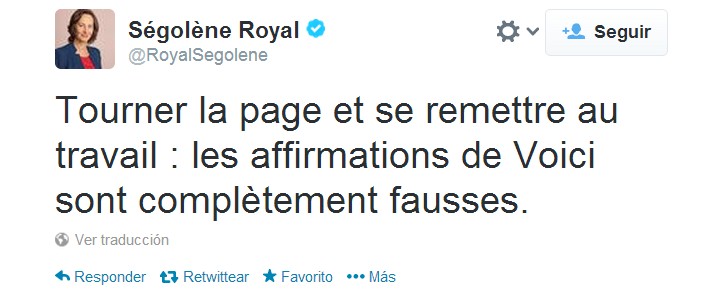 Ségolène Royal ha desmentido desde su cuenta en Twitter que haya visitado a Valérie Trierweiler tras el escándalo suscitado por la relación sentimental que mantiene el presidente francés, François Hollande, con la actriz Julie Gayet. Las informaciones de la visita, desmentida ahora por la exmujer de Hollande y madre de sus cuatro hijos, situaban un posible encuentro entre ambas mujeres en la habitación del hospital parisino Pitié Salprêtière, donde fue ingresada Trierweiler, tras conocerse el escándalo.