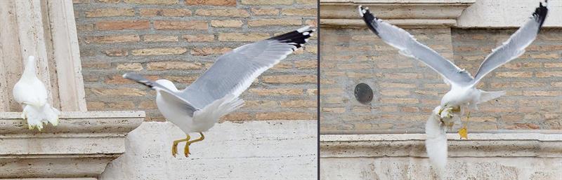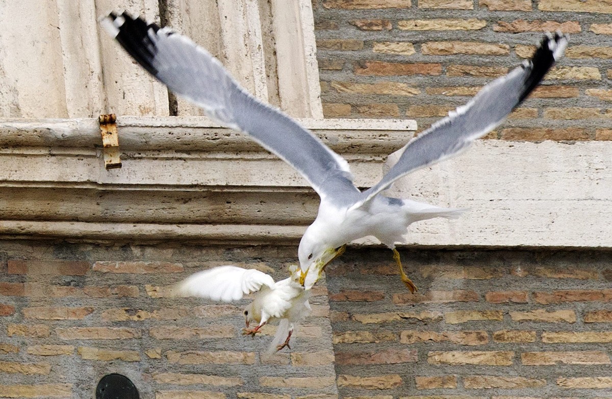 Una gaviota y un cuervo se abalanzaron sobre dos palomas que habían sido liberadas por dos niños junto al papa Francisco, que había pedido por la paz en Ucrania.