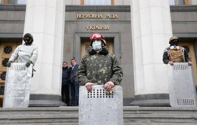 En Kiev, pequeños grupos de manifestantes armados y protegidos con cascos, vigilan y controlan los accesos a la Rada Suprema (Parlamento), la sede del Gobierno y la administración presidencial.