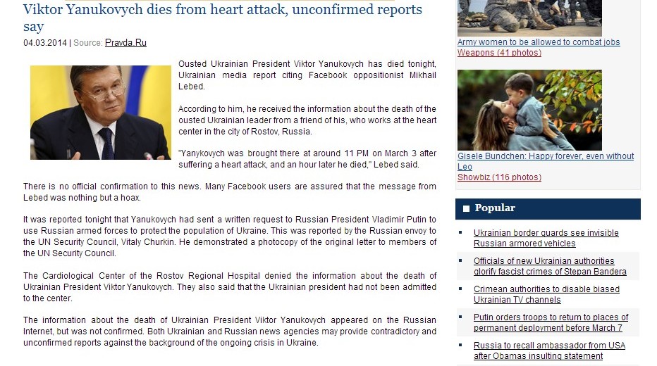 "Yanukóvich ha muerto. Me lo acaba de comunicar por teléfono un amigo que trabaja en el Centro de Cardiología de Rostov del Don. Lo llevaron allí a las 11 de la noche del 3 de marzo, sufría un ataque al corazón, y una hora más tarde murió", escribió Lebed en la red social.