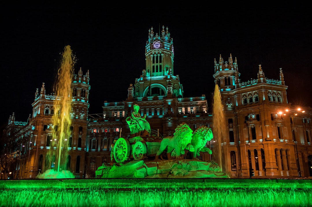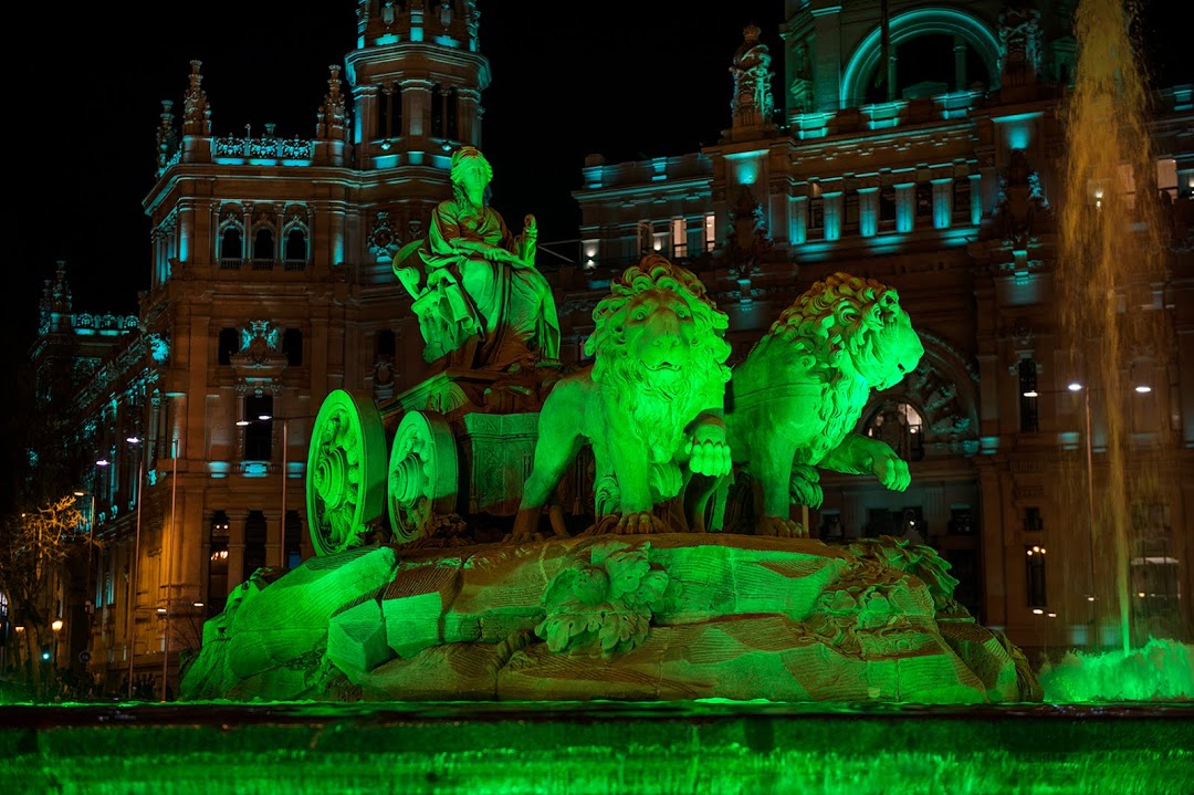 La fuente de Cibeles también se tiño de verde con motivo del día de San Patricio.