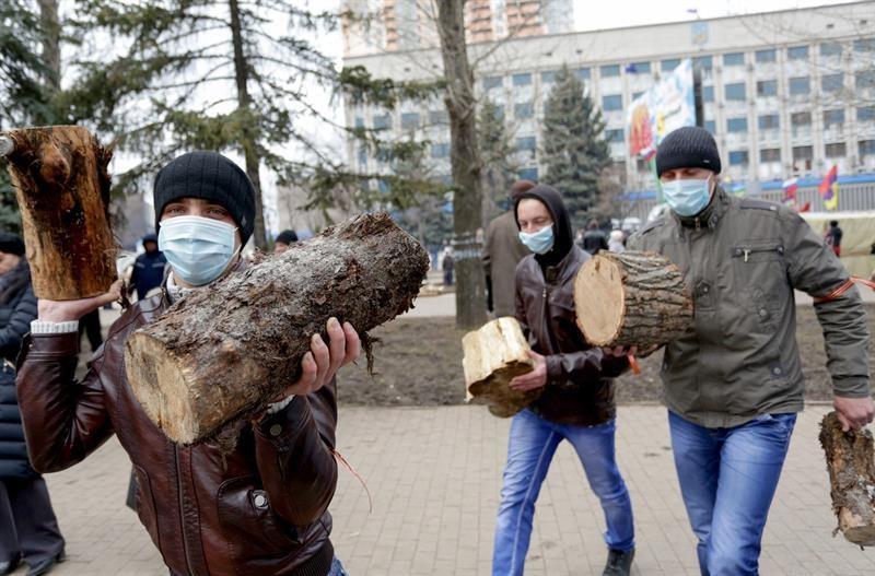 Varias decenas de activistas, algunos de ellos pertrechados con bates de béisbol, custodian la entrada de la sede del departamento del Interior, frente a la cual han instalado un poste fronterizo ruso para marcar simbólicamente el territorio.