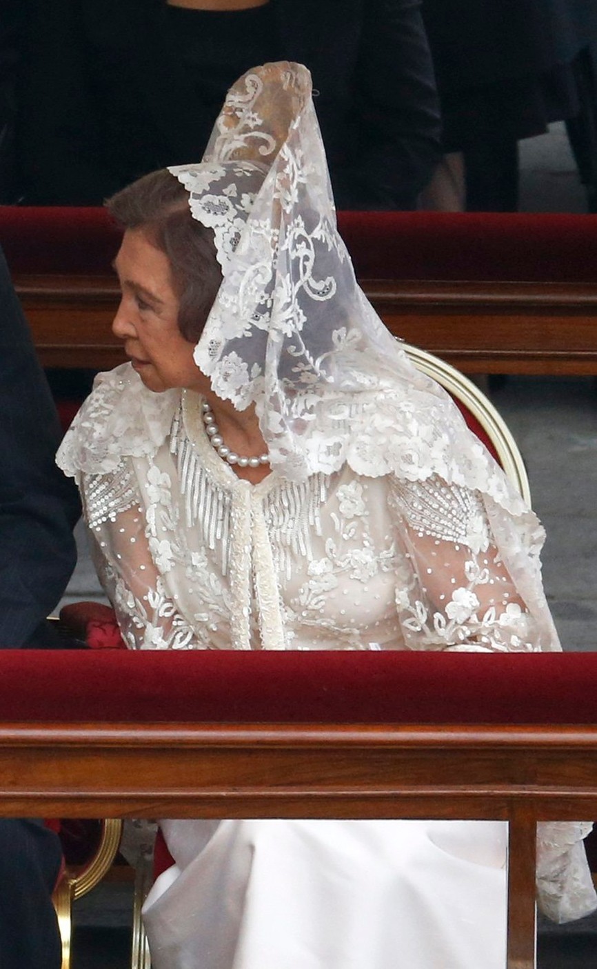 La Reina vistió de blanco y con mantilla blanca, dispensa papal que se remonta a la Reina Isabel La Católica y su contribución a la Iglesia