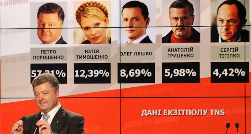 Según los tres sondeos a pie de urna, Poroshenko habría ganado los comicios con entre un 55,7 y un 57,3 por ciento de los votos, muy por delante de la ex primera ministra, Yulia Timoshenko.