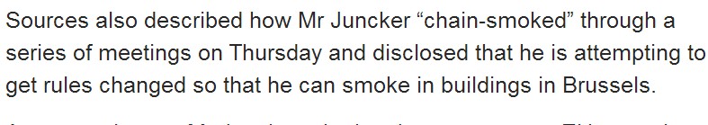 El periódico asegura tener fuentes diplomáticas en Bruselas que alegan " que el consumo de alcohol ha sido planteado por distintos líderes desde las elecciones al parlamento". Otra fuente diplomática del periódico inglés iba más allá y aseguraba que "toma coñac en el desayuno". Asimismo, The Telegraph, en su información, mantiene que Juncker trata ahora de cambiar la legislación para permitir fumar en los edificios de Bruselas.