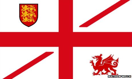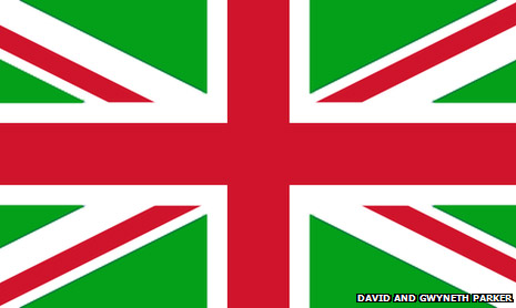 Otra forma de incorporar a Gales sería introduciendo el verde de la mitad de su bandera como fondo, pero el resultado es demasiado parecido a la ikurriña vasca -y esto no es una casualidad: Sabino Arana copió la Unión Jack para inventarse la bandera del PNV-.