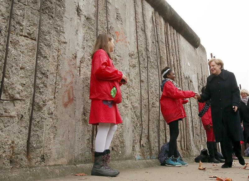 La canciller alemana Angela Merkel saluda a unas voluntarias de los actos de conmemoración del 25 aniversario del derribo del Muro de Berlín