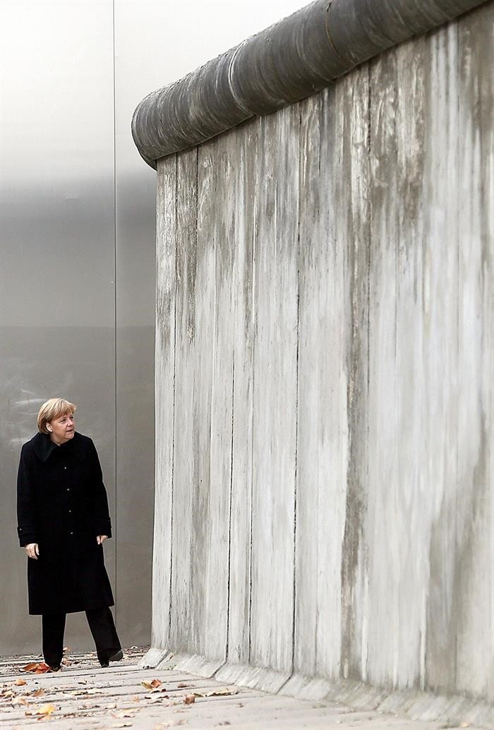Angela Merkel frente a uno de los restos del Muro